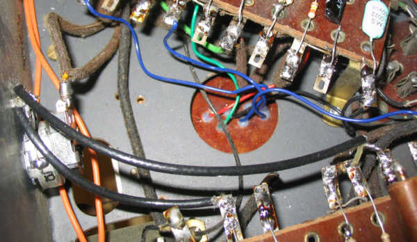 J'ai remis en route ce châssis pour un ami, je n'ai pas la caisse, mais je pense que cette petite page pourra vous aider au cas où vous auriez à refaire un poste identique... Tout d'abord, voici quelques photos du châssis vu de face : A droite, l'alimentation et la lampe de puissance, à gauche, les bobinages sont tous sous blindage... Vu de dessus : vu de l'arrière, à gauche la valve 80 et à côté la pentode de sortie 47 : le câblage du dessous : notez le transfo FI T5, "en vrac" sans blindage ... La plaquette BF : la plaquette HF : le commutateur de gamme GO/PO : détail des condos de découplage hf : à gauche, les paddings de l'oscillateur : les condos de filtrage sont dans une boite; voici les fils de sortie : sous un autre angle; à droite le support de la 47 : Le schéma : La lampe 2B7 est utilisée en reflex FI/BF (et en plus, elle détecte aussi ...) Vous pouvez télécharger le schéma en PDF ici Voici les connexions au HP; comme la bobine d'excitation sert de self de filtrage dans le -HT, il y a 4 fils et non pas 3: J'ai remis en état deux châssis identiques auxquels il manquait 4 blindages alu. Sur les photos précédentes, j'ai utilisé les 4 blindages des deux châssis, mais pour compléter le jeu, j'ai dû en refaire deux... J'ai fait 4 tubes de carton de diamètre 45, recouverts d'alu adhésif et ça marche ! Ils ne sont même pas reliés à la masse ! J'ai mis ces blindages "maison" sur T1 et T2, et conservé les blindages d'origine sur T3 (osc) et T4 (FI#1) : notez la fixation : des cure-dents ! (que j'ai collés tout de même pour que ça tienne...) J'ai dû refaire un cadran également; j'ai fait le dessin à l'ordinateur, imprimé sur feuille de papier ordinaire que j'ai plastifiée. Ce cadran est assez rigide pour être fixé sur la tôle conique percée de 5 trous. Vous pouvez télécharger le cadran en PDF ici Voici le châssis réinstallé dans sa caisse : Pas mal, ce poste, non ?