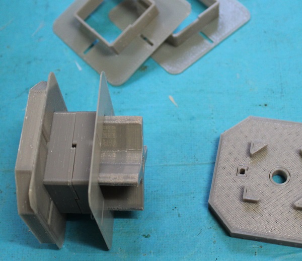 Je dis "écrous rapides" car la pièce grise est une sorte de virolle qui maintient les 2 parties d'un écrou que j'ai scié en 2. Ainsi, je n'ai pas besoin de visser (ou dévisser) les écrous tout le long de la tige filetée qui est assez longue (prévue pour des grandes bobines)