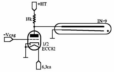Ce tube allongé présente une lueur longiforme dont la longueur est fonction de l'intensité dans le tube. Il a deux électrodes, une anode et une cathode. En gros, la longueur maxi est de 10 cm, et il faut environ 12 mA pour l'atteindre. Ce n'est pas tout à fait linéaire, mais peut importe. On doit pouvoir utiliser ce néon tel quel dans l'alim écran d'une lampe FI, mais le mieux est de le commander par une triode; voici le schéma : Pour celui-ci il faut donc le 6,3V de chauffage et le +HT (250V).