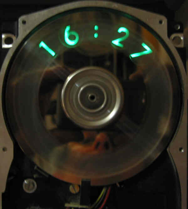 On trouve facilement maintenant des disques durs de quelques Go complètement obsolètes ... que peut-on en faire ? Oui je sais, on peut les jeter. Mais on peut aussi s'amuser à les transformer en pendule ! Voici ce que ça donne : Pal mal, non ? Comment ça marche ? Le principe est (encore) basé sur la persistance rétinienne de nos yeux. Un disque comportant des évidements en forme de chiffres tourne à vitesse constante. Un détecteur permet de connaitre la position angulaire du disque par rapport à une position de référence (qui est tout en bas). Cette référence permet d'allumer les 5 points d'éclairement au travers des chiffres du disques, aux bons moments pour ne faire apparaitre que les chiffres désirés. Par exemple, si on veut faire apparaitre le "1" aux chiffres des unités, on calcule le temps que le disque met pour passer de la position de référence, à la position "1" en face de l'éclairage des unités. Le processus se répète environ 21 fois par seconde (le disque fait un tour en 48 ms), autrement dit, même si l'éclairage est pulsé, il parait fixe pour nos yeux. Voici le schéma de l'appareil : le micro est un PIC 16F84. 5 sorties commandes 5 groupes de 4 LED haute luminosité; un opto détecteur à fourche détecte le point "zéro" du disque, situé entre les chiffres 4 et 5 3 autres sorties commandent un registre à décalage qui permet de générer les 6 commandes de synthèse du triphasé Les circuits de puissance de commande des 3 phases moteur détail d'une phase. Les commandes sont isolées par des opto-coupleurs L'alimentation est basique, elle consomme environ 20W sur le secteur, il faut donc prévoir un transfo en conséquence. Les 2 régu sont sur radiateur Vous pouvez télécharger le schéma complet en PDF ICI et celui de l'alim ICI Quelques explications techniques : Le moteur d'entrainement du disque est un brushless, autrement dit un moteur synchrone triphasé. Pour le commander, il faut donc générer 3 tensions déphasées de 120°, et normalement sinusoïdales. Bon, on peut se contenter d'un pseudo-sinusoïdal en signaux rectangulaires suivant les chronogrammes suivants : On voit que chaque phase a un rapport cyclique de 1/2 ce qui limite la puissance en préservant le fonctionnement. Le disque comporte une échancrure qui est détectée par le détecteur optique à fourche : Les chiffres ont été découpés dans une feuille de papier ordinaire, imprimée en fond noir, puis collés sur l'envers du disque L'opto-détecteur envoie un signal au PIC (entrée RA2) qui remet à zéro un compteur de millisecondes (qui ne va pas plus loin que 47 donc puisque le tour dure 48 ms). En fonction du compte de la pendule (heures, minutes), les commandes C1 à C5 des LED sont commandées avec un retard adéquat suivant le tableau suivant : On voit que la commande de C3 a toujours le même retard puisque c'est toujours le même caractère (:) qui est allumé par C3. Par contre, pour les autres commandes, tout dépend de l'heure. Par exemple, lorsqu'il est 15h00, C2 va s'allumer avec un retard de 29 ms, juste au moment où l'alvéole comportant le chiffre "5" va se trouver en face des LED L2. La pendule est synchronisée par la fréquence du secteur, ce qui assure une stabilité à long terme (presque) parfaite. Il faut ajouter aussi que le moteur n'est pas alimenté dès le démarrage à pleine vitesse, mais qu'il est, au contraire, accéléré progressivement de 136 ms / tour à 48 ms/tr. Sans cette précaution, il ne s'accroche pas correctement. La phase d'accélération dure environ 20 secondes. Voici maintenant quelques photos de la maquette : Le disque dur. Notez les 5 groupes de 4 LED et le détecteur à fourche tout en bas Pour diffuser la lumière, une petite couronne de papier claque est disposée au-dessus des LED Le disque dur est fixé comme à l'origine. Vue du côté gauche. L'alim est entourée en jaune, la carte PIC en bleu et la carte moteur en violet Vue de l'arrière. En bas l'alim et son connecteur vert, en haut la carte PIC Vue du côté droit Vue plongeante La pendule en fonctionnement Phase de démarrage : les chiffres s'allument de façon incohérente Après 20 secondes, l'affichage est stable. La pendule est mise à 12h au démarrage, il faut donc la régler Les 2 boutons poussoirs de mise à l'heure (en violet, les heures, en bleu les minutes) la pendule est maintenant à l'heure ! Lors de la construction de la pendule suivante, j'ai acheté des LED vertes haute luminosité et pour changer, j'ai équipé cette pendule, voici ce que ça donne : pas mal non plus en vert ...