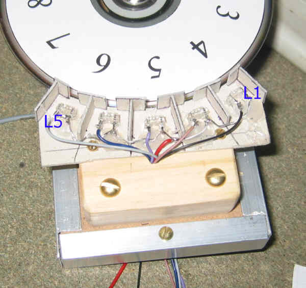 Les pendules précédentes utilisent un disque dur ce qui nécessitent de le percer soit de quelques petits trous pour faire un disque de Nipkow, soit de gros trous dans lesquelles des formes découpées laissent passer la lumière. Leur principe est donc basé sur la transmission de la lumière. Cette nouvelle pendule, au contraire, est basée sur la réflexion de la lumière. Ce procédé présente au moins ces deux avantages : - le disque n'a pas besoin d'être percé - il est facile de changer les caractères si besoin Ainsi, un simple CD ou DVD devenu inutilisable sera notre support des caractères : Il suffit d'y coller un disque sur lequel on aura imprimé les caractères : Les caractères seront éclairés aux bons moments par des leds haute luminosité blanches situées dans des compartiments munis de fentes : Les fentes permettent de limiter le faisceau de façon à n'éclairer qu'un seul caractère à la fois par une led : Les compartiments des sources lumineuses sont fermés par un couvercle : Pour synchroniser l'éclairage stroboscopique, un simple adhésif noir est collé sous le CD : en violet, c'est le bord droit qui compte pour la synchro, on ajuste au cutter l'instant exact de synchronisation en vérifiant le centrage des caractères affichés et un détecteur optique par réflexion est installé sur la platine support : ce photo détecteur agit par réflexion sur la surface inférieure du disque, les 2 composants - LED IR et photo-transistor - sont donc inclinés du bon angle L'entrainement se fait en utilisant un moteur récupéré sur un lecteur de CD (ou de DVD) : Voici quelques photos de la platine de cette pendule : Cette platine est assemblée avec le socle qui soutient l'alim secteur afin d'incliner le disque : avec cette inclinaison, il est plus pratique de lire l'heure, mais ça oblige à faire un système pour retenir le disque sur le moyeu du moteur et maintenant, voici ce que ça donne comme affichage : Pour finir, voici le schéma de cette pendule , et son alim Dans l'alim, vous remarquerez un relais qui commute une résistance parmi deux dans le circuit du régulateur LM317K. Lors de la phase d'accélération du moteur, celui-ci est alimenté en 5V pour le "booster" afin qu'il ne décroche pas lors des changements de vitesse. A la fin de la phase d'accélération, lorsque le moteur a atteint la vitesse nominale, son alimentation est descendu à 4,4V, valeur suffisante pour maintenir son régime. Pour information, le disque tourne à la vitesse de 1666,67 tr/mn (1 tour en 36 ms), et les leds sont allumées pendant seulement 100µs, avec des retards après la synchro (qui se produit lorsque le "0" est tout en bas) conformément au tableau suivant : Comme indiqué, ces valeurs sont à diviser par 2 et sont en millisecondes. Vous remarquerez aussi que le "0" des dizaines d'heures n'est pas affiché, par conséquent la case "0" pour L1 ne contient pas de valeur, c'est la case " " pour L1 qui est utile. De même, la colonne L4 ne contient pas de valeur pour "6" à "9" : valeurs jamais prises par les dizaines de minutes ! Conclusion : ne jetez pas non plus les vieux lecteurs de CD/DVD !