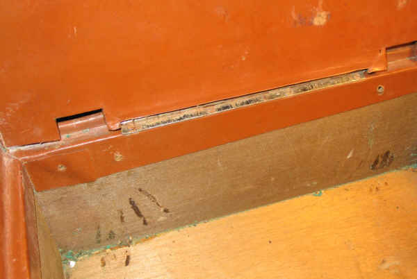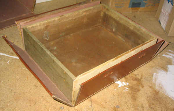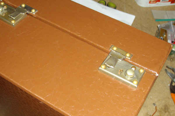Avant de procéder il convient de bien repérer tous les éléments fixés sur la mallette; pour cela, quelques croquis avec les cotes de positionnement seront nécessaires. Première chose à faire, désolidariser coouvercle et fond en enlevant les charnières : puis la poignée : les serrures : les pènes : enfin le rabat intérieur : Dans le couvercle, il faut enlever les supports du baffle en les repérant aussi : Maintenant, il suffit, pour le couvercle et le fond de couper les coutures dans les coins : et les boites en bois s'en vont toutes seules : le revêtement avait été réparé dans un coin du fond : Voici la caisse toute nue :