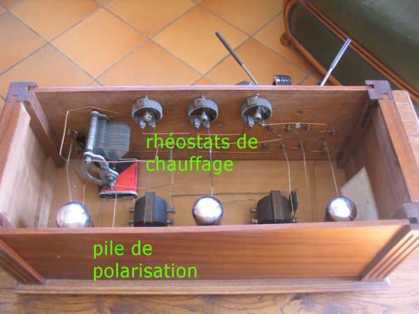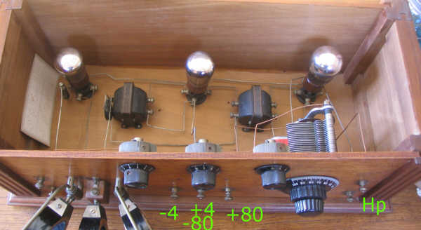 Ce poste européen est ce qui se faisait en standard dans les années 25-29 en France; celui-ci est un montage amateur, un kit de l'époque. Sur la gauche de la face avant, on trouve 3 bobines, dont 2 pivotantes : Celle du milieu, fixe est celle d'accord; celle de gauche est le primaire d'antenne et celle de droite la réaction : Autrement dit, en pivotant celle de gauche, on règle le couplage d'antenne, et en pivotant celle de droite, on règle le taux de réaction jusqu'à la limite d'accrochage. Les bobines sont amovibles; il y a un jeu de 3 bobines pour une gamme d'ondes. Donc, il pouvait y avoir jusqu'à 12 bobines pour ce genre de poste ! L'accord se fait grâce à un CV placé sur la droite : Les alimentations nécessaires se connectent sur 3 bornes centrales; il faut une source de 4V pour le chauffage et une source de 80V pour les circuits d'anode des lampes : A l'intérieur on découvre le peu de composants : Principalement les 3 lampes (la détectrice est à gauche), les 2 transfos de liaison BF et le CV : Le HP se connecte sur les 2 bornes de droite : Le chauffage de chaque lampe est réglé séparément; il y a donc 3 rhéostats. Remarquez également, sous le CV, la pile de 4,5V de polarisation de la lampe de puissance : on voit mieux la pile sur cette vue latérale : Voici le schéma de ce poste : C'est vraiment ce qui se faisait de plus simple en 3 lampes ! Je pense que ce schéma pourra vous servir, étant vraiment universel et représentant la majorité des postes 3 lampes de l'époque.