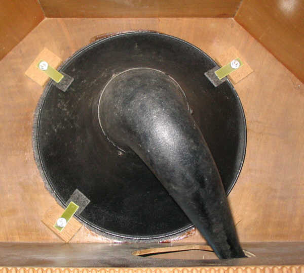Il est temps de poser le châssis dans la caisse pour voir si je peux installer le HP; voici le châssis dans la caisse : Il faudra que je modifie les traverses supports car pour l'instant tout le câblage inférieur porte dessus ... Vue de l'avant; pas mal, hein ? J'ai donc essayé de positionner le HP: hélas, tel quel, il ne passe pas, la partie droite du châssis gêne. Il faut donc que je modifie la liaison moteur-pavillon ! Je décide de confectionner un coude à 90° qui me permettra de positionner plus facilement le moteur. Petit problème : le diamètre de l'accouplement est 17 mm....je vais donc utiliser des éléments de tuyauterie en cuivre avec des cales de compensation. première chose : un coude de 18 qui viendra sur l'embout du moteur; sur la photo, la cale d'épaisseur, découpée dans une boite en fer blanc : La voici insérée dans le tube, remarquez la vis pointeau de blocage et son écrou laiton soudé sur le tube : voici comment ce coude vient sur le moteur : maintenant, il faut une réduction 18-14 qui sera coiffée par le pavillon; en effet, du côté 14 (intérieur) la réduction fait 16 extérieur : il suffit de souder à l'étain (chauffé sur un brûleur de la cuisinière ....): une autre cale d'épaisseur dans l'embout du pavillon : et voici la liaison installée dans le pavillon : il n'y a plus qu'à fixer le moteur : Passons au positionnement dans la caisse .... il faut emboiter le moteur par le trou de la cloison : Avec cette liaison réglable, je peux maintenant positionner le moteur sans être gêné par la lampe L1 : Bien, il faut maintenant faire les fixations du pavillon. Il suffit de 4 plots en bois, collés sur la caisse et comportant un boulon : Ils sont collés à la colle à bois à des emplacements à 90° : Il n'y a plus qu'à attendre la prise de la colle .... Le pavillon du HP ne doit pas venir directement sur la caisse, pour éviter des vibrations parasites; il faut alors interposer une cale en matériau absorbant. Le mieux est d'utiliser une chute de feutre (récupération revêtement coffre automobile) dans laquelle j'ai découpé une couronne que j'ai collée (colle néoprène) : Notez sur chaque plot, une languette en epoxy fixée à l'aide d'une rondelle et écrou. Il faut découper aussi 4 petits patins : qu'il faut installer sur le pavillon, là où les languettes vont appuyer : Il n'y a plus qu'à serrer (modérément) les 4 écrous : Voilà le pavillon installé ...