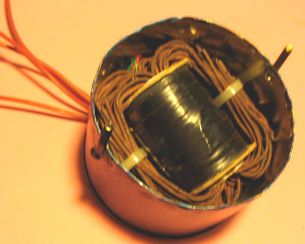En attendant la prise de la colle, j'ai le temps d'essayer le HP sur le châssis.... Il suffit de relier les 2 bornes du moteur aux 2 bornes HP+ et HP- du châssis (pour l'instant, je ne connais pas la polarité, je la déterminerai plus tard...) Résultat : très mauvais dans les basses ! Normal : l'impédance n'est pas bonne (8 fois trop faible) donc l'inductance est faible ce qui veut dire que pour les basses fréquences, la résistance de charge est très faible, et la lampe n'amplifie quasiment pas ! Pour m'en assurer, je câble vite fait un transfo 220v-36v, ce qui donne un rapport de 7 environ -autrement dit, l'impédance est multipliée par 50- et là, les basses sont bien mieux restituées. Bien je sais ce qu'il me reste à faire : - rebobiner le moteur en 5/100 OU - faire un transfo d'adaptation. La première solution ne présentant pas trop d'intérêt informatif, je vais plutôt faire le transfo, ce sera l'occasion de vous montrer comment faire ....