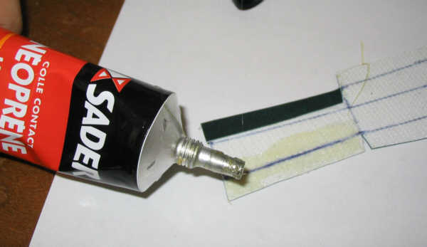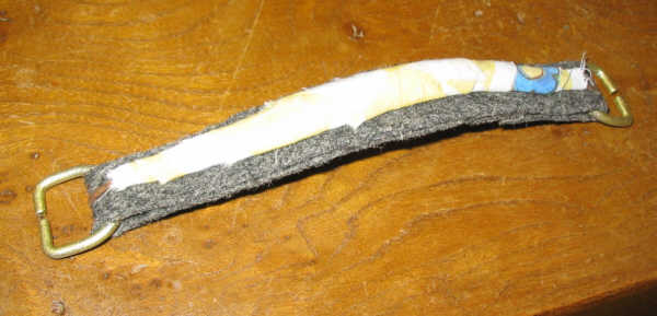et si j'essayais de refaire la poignée ?... tout d'abord, j'ai décousu celle d'origine, voici les pièces : de haut en bas : - pièce A: en cuir peu épais, elle recouvre l'ensemble et a deux rabts en dessous. - pièce B: une tringle en acier, recouverte de coton sur un diamètre de l'ordre de 12mm, en demi-rond, c'est elle qui assure la rigidité. - pièce C-D: c'est une seule pièce (coupée en deux par l'usure) en cuir épais (3mm). Elle est repliée sur elle même, et la tringle B l'entoure. - pièce E: un morceau de bois 1/2 rond qui vient en dessous de la pièce C-D, avec le coton de la pièce B, c'est ce qui donne la forme vaguement cylindrique de la poignée. - pièce F: en cuir comme la pièce A, elle vient en dessous de l'ensemble, sur les 2 rabats de la pièce A. Voici les patrons des pièces de cuir, ainsi que les cotes des autres pièces : Pour plus de détails, fichier PDF Première opération, la confection de la pièce C-D. J'ai utilisé une bande découpée dans un tapis de coffre de voiture...c'est très solide comme matériau : pour faciliter la couture finale, j'ai collé les 2 parties de la bande après passage autour des 2 anneaux (que j'ai bombés en peinture dorée) : une fois la colle prise, voici la première pièce, ébauche de la poignée : J'ai conservé la tringle B, déjà recouverte, mais partiellement, par une bande de tissu, et l'ai recouverte par un aller et retour d'une bande de tissu de 3 cm de large environ, juste pour "rafraichir" : il faut insérer les 2 extrémités en épingle autour de la pièce C-D : la pièce en bois, E, a été carrément récupérée : elle n'a pas trop souffert du temps, et au moins, elle est aux bonnes cotes. Je l'ai simplement recollée sous la pièce C-D. Il faut bien maintenir l'ensemble dans sa forme naturelle à l'aide de pinces : Lorsque la colle est prise, la poignée est prête a être recouverte: tout d'abord, découper les pièces A et F suivant les patrons, en ajoutant environ 5 mm tout autour : en effet, pour que les tranches de couleur blanche ne se voient pas, le mieux est de replier le simili en dessous en collant à la colle néoprène : C'est le moment de vérifier la pièce A en la plaçant sur la poignée : pas assez large ! zut ! Je refais une pièce A, plus large de 2 mm. La pièce F est correcte. cette fois-ci, la pièce A est bonne : je peux commencer à coudre. J'ai au préalable teinté le fil de coton. Je l'ai noué à la tringle en fer : Notez la position de la pièce A. Ses extrémités sont rabattues en dessous et maintenues provisoirement par des pinces, le temps de faire quelques points de couture : dès le 3° point, il faut coudre la pièce F en même temps : Il faut coudre les 2 côtés, bien sûr. Le fil est stoppé par un double point et l'insertion et collage à l'intérieur, entre les 2 parties de la pièce C-D (invisible) : Voici la poignée terminée : je ne suis pas un spécialiste du point régulier .... : mais bon, pour un débutant ... Je peux maintenant installer la poignée sur la caisse : Voilà, l'extérieur de la caisse est fini :