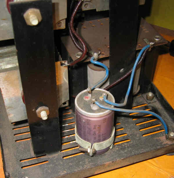 Pour relever le schéma qui devrait être simple, il faut déjà ouvrir l'appareil. La partie supérieure du boitier tient par 4 vis au socle; Les composants à ailettes sont les redresseurs au sélénium, ils sont vraiment imposants ! (cliquez pour agrandir) Il y a aussi un transfo et une grosse self (cliquez pour agrandir) Et un double condo de filtrage Vue de dessus : (cliquez pour agrandir) Deux condos entre chaque pôle du secteur et la masse du boitier (qui est reliée à la terre) Bref, rien de bien compliqué. Voici le schéma que j'ai relevé : (cliquez pour agrandir) Il y adeux particularités dans ce schéma : - le transfo secteur, est un vrai transfo d'isolement, pas un autotransfo et il comporte des prises au primaire et au secondaire afin d'ajuster la tension redressée en fonction du courant consommé (en effet, suivant ce courant, la chute de tension dans les redresseurs varie) - le constructeur à choisi d'utiliser 18 éléments Sélénium par branche du pont. Or, les grands redresseurs n'en comportaient que 32 chacun, il a donc ajouté un troisième redresseur à 8 éléments. C'est un peu bizarre mécaniquement, surtout qu'il était possible d'ajouter les 4 éléments au bout des 32 ...