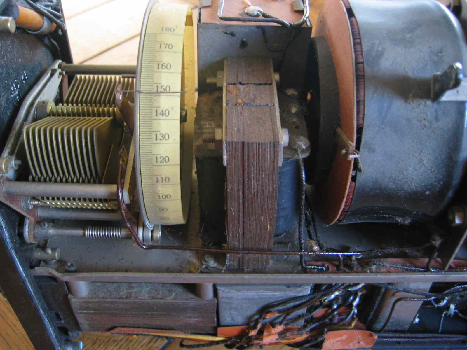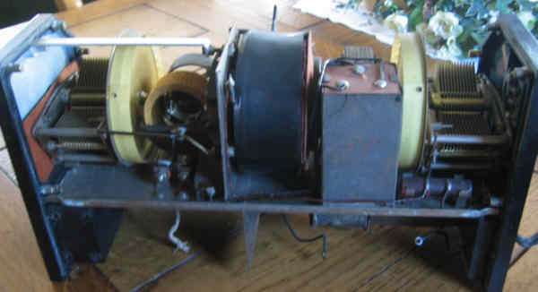 Voici un grand classique de PHILIPS, le 2514 : (cliquez pour agrandir) Ce poste est pour moi sentimental, en effet, c'est le premier poste que j'avais acheté, en 1978, avec un autre poste batteries de la même époque et c'est là que j'ai découvert les lampes européennes à broches ! Quand j'ai vu celui-ci à vendre, je me suis dit que serait bien de se replonger dans ses entrailles pour faire une sorte de pélerinage, donc ... D'autant que, comme on va le voir, ce poste ne déroge pas à la règle Philips de câblage : "plus c'est serré, mieux c'est !" Continuons la visite : A gauche, 2 boutons l'un pour l'accord primaire, l'autre pour le gain HF. 3 douilles d'antenne et le câble secteur et le fil de terre(cliquez pour agrandir) A droite, deux autres boutons, l'un pour l'accord secondaire, l'autre pour la réaction. 2 douilles pour le haut-parleur En face avant, au milieu, la manette de commande de gamme De part et d'autre de cette manette, les 2 cadrans des accords (P=primaire, S=secondaire) Détail que l'on retrouve des 2 côtés (cliquez pour agrandir) L'arrière du poste (cliquez pour agrandir) La prise secteur d'époque Le dessous : on devine que c'est par là qu'on ouvre la bête ... L'étiquette constructeur