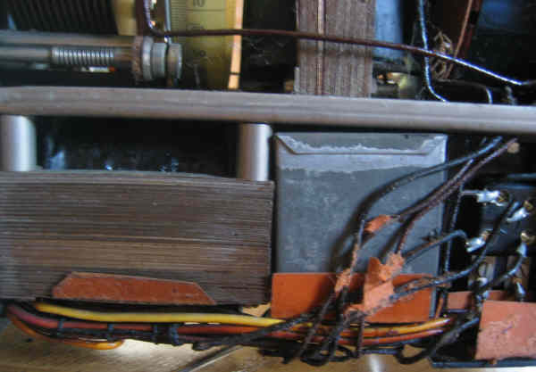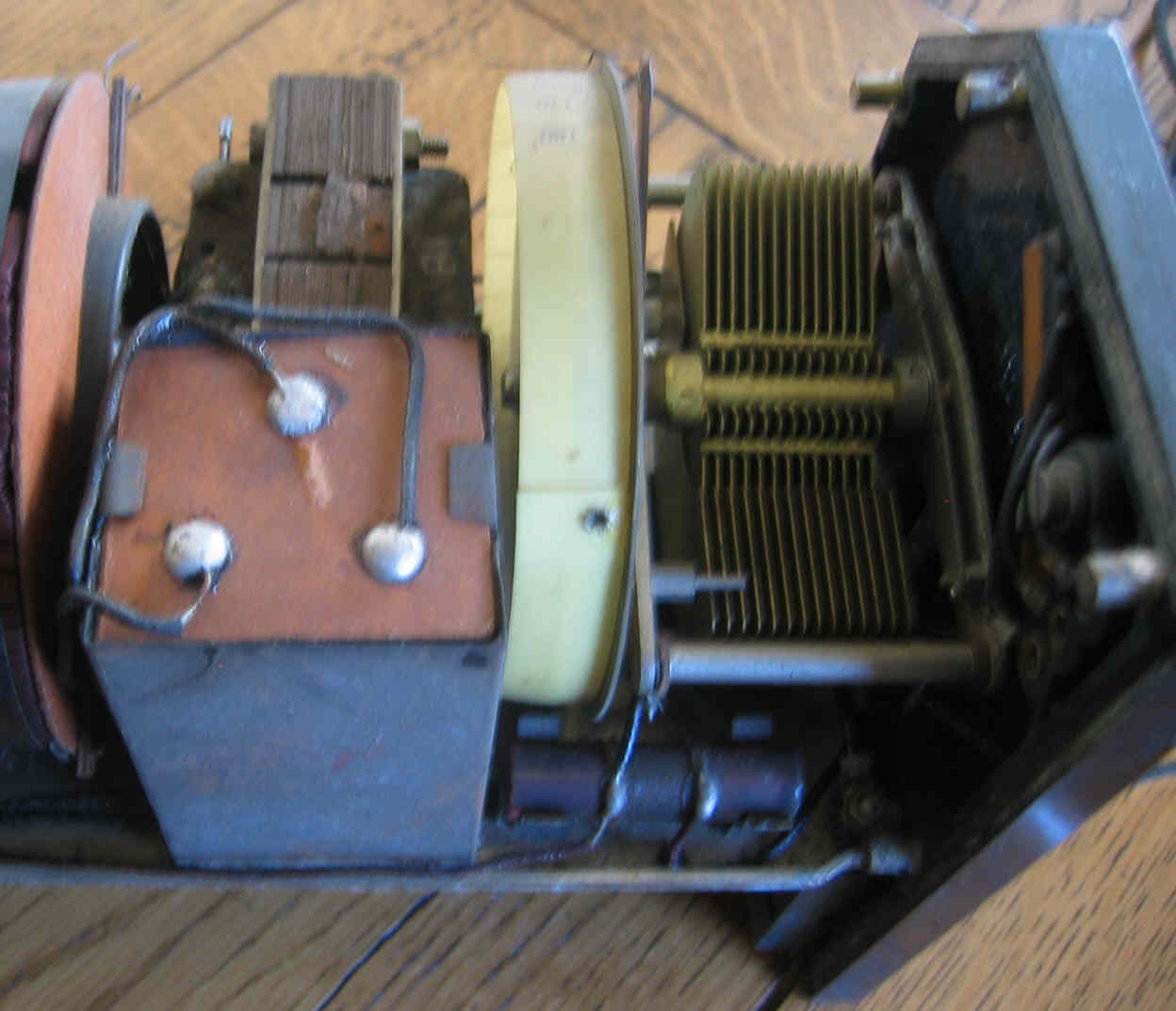 L'accès aux lampes se fait de la manière suivante : La plaque glisse dans des rainures A noter que sur mon premier poste, des ficelles munies de plombs de garantie, empêchaient le coulissement de cette plaque. Ces ficelles passaient par les trous que l'on peu voir dans les coins de cette plaque et de l'autre partie de la boite. Le compartiement des lampes (cliquez pour agrandir) A l'intérieur de la plaque de fermeture, il y a un contact qui coupe un pôle secteur, empêchant l'alimentation du poste s'il est ouvert Les 2 lampes côté gauche Et les 2 à droite. Noter l'installation de l'une d'entre elles ... Tiens, la plaque de protection des connexions du transfo et d'un bloc de condos n'est plus fixée : bizarre ...espérons que cela n'indique pas que le transfo est mort ... Il y a un joli timbre taxe collé sur cette plaque : Sans cette plaque, on voit bien les connexions du bloc de condos : On y reviendra puisque on a là un des composants critiques que je change systématiquement(cliquez pour agrandir) Continuons l'inspection : Tiens, normalement, on devrait avoir une triode à 4 broches à cathode ramenée sur une borne latérale; là c'est une E424 5 broches qui était installée et la reprise de cathode est bricolée Les lampes installées (D100, V430, E424, E442 Seule la E442 semble d'origine ... ce qui veut dire qu'elle doit être morte ou presque. La D100 est équivalente à la B443 La V430 est qéquivalente à la 1802. C'est une valve monoplaque alors qu'on devrait avoir une 506, biplaque. Le poste ouvert, sans ses lampes (cliquez pour agrandir)