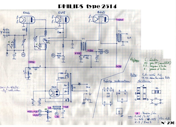 En 1978, je n'avais pas relevé le schéma, mais je l'avais fait sur mon premier 2514, lorsqu'il était tombé en panne; le voici, "version manuscrite", de 1982 : (cliquez pour agdrandir le schéma) Puis, lors d'une seconde panne, je l'avais refait au propre sur ordi (2006) : Schéma avec les valeurs de la nomenclature Philips(cliquez pour agdrandir le schéma) Version PDF à télécharger ICI J'avais aussi mis au propre les croquis des 2 blos de condos : Les nombres correspondents à ceux du schéma, à chaque électrode des condensateurs Quelques explications : Le montage est classique : une lampe HF amplificatrice , accordée dans sa grille et dans son anode. Les bobines sont accordées chacune par un CV indépendant et comportent des prises pour faire 3 gammes de réception. Le gain du montage est réglable par modification de la tension de grille de lampe, -P3. C'est là le point critique : en effet, la E442, bien que n'étant pas à pente variable, présente, dans sa caractéristique, une courbure suffisante pour qu'elle puisse être tout de même considérée comme telle. Cependant, la variation de tension se fait sur une plage assez petite. Or, ce réglage permet de régler la puissance sonore. De plus, la tension de polarisation est créée par résistances dans le retour du -HT, autrement dit, cette tension dépend du courant consommé sur la HT par les lampes, surtout la pentode de sortie. Donc quand la pentode de sortie est usée, elle consomme moins, la tension de polarisation est trop faible, on ne peut plus régler le volume au minimum. On a alors une sorte de régulation puisque si la pentode de puissance est faible, il faut plus de gain HF, mais au bout du compte, on observe que le poste est "plat" : le réglage de volume semble ne plus agir et la puissance sonore est faible. De plus, comme on a moins de gain HF, l'accord se fait moins bien aussi, on perd en sélectivité. Le signal HF est détecté par la grille de la triode BF, polarisée par la tension -P1, assez faible. La self S5, pivotante entre les selfs S3 et S4, procure une réaction. Une prise PU est prévue, dans ce cas, la grille est polarisée par la polarisation variable -P3, le potentiomètre agit donc comme réglage de volume en faisant varier le gain de la triode BF E415 (qui elle non plus n'est pas une lampe à pente variable, mais on joue encore sur le peu de courbure de la caractéristique). . La liaison à l'étage de puissance est assurée par le transfo T2 qui est spécial car le fil utilisé est résistif, ce qui fait que les valeurs de résistance de ses 2 bobinages sont élevées et pourraient paraitre bizarres ! Enfin l'étage final comporte une pentode de puissance qui est polarisée par une prise sur la self de filtrage et comporte un transfo d'isolement en sortie (rapport unité) qui ne sert qu'à supprimer la composante continue dans le HP L'alimentation est standard : redressement double alternance, filtrage par le moins (la self est dans le retour) ce qui implique que les pôles "+" des 2 condos de filtrage sont reliés ensemble. Le potentiomètre P1, la résistance R9 et la self forment un pont potentiométrique qui permet de créer les 3 tensions de polarisations, dont une qui est variable (pour le gain HF) A noter qu'il n'y a pas eu, à ma connaissance, de transfo secteur multi-tensions, chaque poste étant prévu pour une seule tension. Tension d'ailleurs assez particulière : par exemple, mon premier 2514 est marqué "111V" et celui-ci est semble-t-il prévu pour "118V" ... A croire que Philips bobinait les transfos pour toutes les valeurs de tension, au volt près !