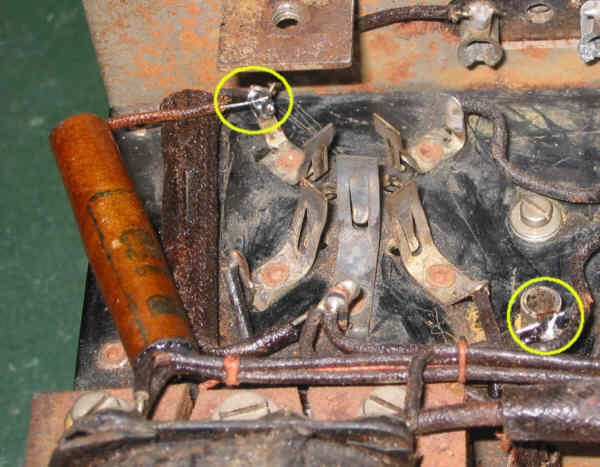 Les composants principaux étant vérifiés et/ou réparés, on peut maintenant procéder à un premier essai d'ensemble qui consiste à vérifier que les tensions diverses sont correctes. Dans le cas probable où il n'y aurait pas de panne cachée, on peut même espérer une réception ! Pour cet essai, il suffit d'installer les lampes : De gauche à droite : E424 - B443 - E442 - 506 (cliquez sur la photo pour l'agrandir) de connecter un HP haute impédance sur la prise adéquate : une antenne sur une des prises, j'ai choisi A2 : (il n'est pas utile de connecter la terre, puisque le retour HF se fait au secteur par les condos C9) et de brancher le câble secteur. Il est prudent aussi de connecter un voltmètre entre le +B et la masse, pour voir si tout se passe normalement : Résultats : Dès la mise sous tension, un très léger bourdonnement se fait entendre, ce qui est normal puisque la valve 506 et la pentode BF B443 sont à chauffage direct. Cependant, la tension ne monte qu'à 80V environ ... Après 30-40 secondes de chauffage, on entend France Inter ! Même avec une HT faible, le poste fonctionne. Un problème se manifeste également lorsqu'on tourne le CV d'accord primaire : la réception s'affaiblit d'un seul coup, puis revient si on déforme le support du CV. Il doit y avoir un mauvais contact. Globalement, tout à l'air d'aller : le réglage de gain HF agit, ainsi que le réglage de réaction. Les 4 stations principales en GO sont reçues. D'autre part, en installant une bonne valve, les tensions montent à des valeurs tout à fait normales : Ce qui prouve que la valve d'origine est pompée et que le reste des composants est bon ! Je profite de ce premier essai pour mesurer les tensions principales. Elles sont accessibles sur les bornes du bloc de condos : Voilà, toutes ces tensions sont correctes