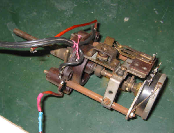 Sur ce récepteur, la commande de mise sous tension, la commande de volume sonore et la commande de gain HF sont regroupées sur le même axe : - en tournant celui-ci on commande R21 qui est le potentiomètre de volume - si on le tourne complètement à gauche, on commande la mise hors tension en agissant sur un interrupteur bipolaire - enfin, en tirant l'axe vers l'avant, on met en service la résistance R30 qui vient s'ajouter à R1 et R2, augmentant la polarisation de L1, donc diminuant le gain HF. Les entretoises ont déjà été dévissées, il n'y a plus qu'à dessouder les connexions ... 025 : dessouder les 2 fils allant vers R30, au niveau de l'interrupteur 026 : dessouder le fil allant vers C35 et R29 au niveau du potard R21 (cosse près des CV) 027 : dessouder le fil allant vers C38 au niveau de la cosse centrale de R21 028 : dessouder le fil allant à la boudinette sur la connexion reliant : la cathode de L3, C49, C36, au niveau de la cosse de R21 la plus près du bloc de condos précemment déposé. 029 : dessouder le fil allant vers S3 au niveau de la boudinette près de la connexion de C2 030 : soulever les fils déjà dessoudés (les 3 de R21, les 2 de l'inter de gain et aussi la ligne +HT) afin de soulever l'ensemble de commande de réglages. 031 : dessouder les 2 fils allant à l'inter M/A, au niveau de C56 032 : dessouder le fil allant à S1 (et à R1), et le fil allant à l'ampoule L7 033 : déposer l'ensemble de commande de réglages en le soulevant de l'arrière pour dégager l'axe. Comme ce châssis n'a plus les selfs S1/S2 ni S3, il est fort probable que le câblage ne soit plus conforme à celui d'origine. Pour déposer l'ensemble de commande, je n'ai eu qu'à dessouder tous les fils qui étaient regroupés sur 4 cosses-relais au-dessus du châssis. Au remontage, ce sera différent si je remets les selfs ...