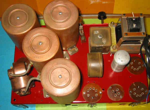 L'inter M/A est HS, il faut le réparer; le potard est à vérifier. L'inter de gain semble en bon état, mais une petite vérification n'est pas de trop ... Potentiomètre R21 015 : mesure du potard R21 (500k normalement) : plus de 3 Mohm ! Je décide donc le changer. 016 : dépose de R21 l'axe est percé d'un trou qui reçoit une goupille. Ce trou est à 15 mm envion du plan de fixation du potard. 017 : préparation d'un nouveau potard de 470KB (LOG), perçage du trou l'axe doit être recoupé à environ 5 mm du trou ! 018 : pour éviter que le potard ne glisse, la rondelle doit être installée ainsi : 019 : orientation du potard 020 : pose de la goupille 021 : repose de la vis 022 : agrafage du ressort sur la goupille 023 : soudage du boitier du potard à la masse Inter M/A Les contacts sont complètement avachis et tordus au point que parfois les plots tournants se coincent. Il faut donc démonter tout ça ... 024 : perçage des rivets 025 : passage à l'acide et polissage des contacts, recambrage 026 : repose par boulonnage des contacts 027 : nettoyage complet à l'essence F, lubrification, vérification du fonctionnement mécanique : OK inter de gain 028 : pulvérisation nettoyeur contacts, vérification résistance : OK repose de l'ensemble 029 : câblage du câble secteur 030 : câblage de C56 et de 2 fils de départ vers les selfs 031 : pose de l'ensemble inters/potards (sans trop serrer les entretoises) et de C56 (sans serrer le boulon) 032 : pose du plot de maintien du support d'ampoule de cadran : la vis et la rondelle sont provisoires, elles fixeront plus tard C55 033 : soudage des 2 fils sur S1/S2 034 : passage du câble secteur par le trou du châssis et fixation sur une colonnette de S1/S2 Essai d'alimentation 035 : Installation des ersatz, et d'une ampoule 24V/5W pour L7, alimentation : 210V DC L'essai consiste à simplement vérifier que l'on obtient les bonnes tensions de chauffage sur les filaments de chacun des ersatz de lampes (car je n'ai pas de lampes d'origine !) L'essai est concluant : l'inter M/A fonctionne parfaitement, chacun des ersatz de lampes est chauffé sous 18 à 20V . L'ampoule d'éclairage de cadran est alimentée par 12-13V environ, l'ersatz de la régulatrice 1928 a 90-100V à ses bornes. Près de 5V en tout sont perdus dans S1/S2. Donc, tout va bien pour l'instant !