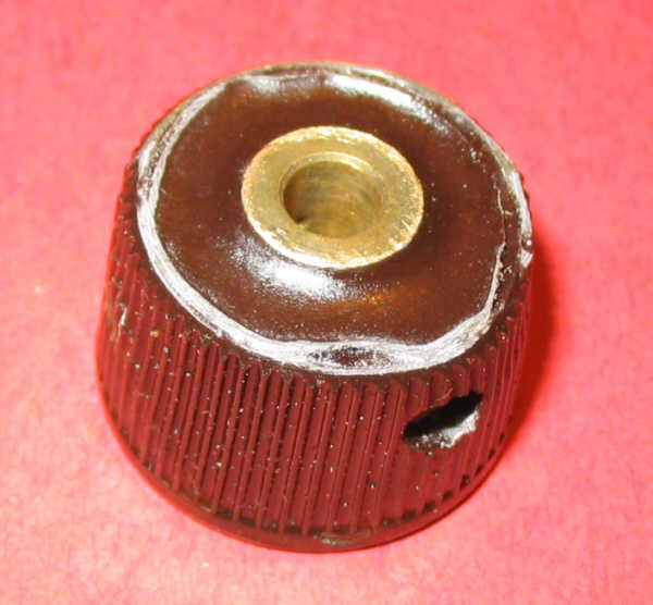 celui-ci était cassé sur une petite partie, l'essentiel était toujours intact, à savoir la face avant et le cylindre intérieur de l'axe. J'ai donc vissé une vis nylon dans le trou taraudé, en la coupant à la bonne longueur par rapport au moule que j'avais déjà fait pour ce genre de boutons j'ai mis le bouton dans le moule, en l'orientant correctement par rapport à la vis et j'ai coulé la résine colorée Voici le bouton démoulé: Il a suffi alors de repercer la vis nylon en 2 mm, de façon à l'enlever. Voici le bouton installé sur un axe du poste