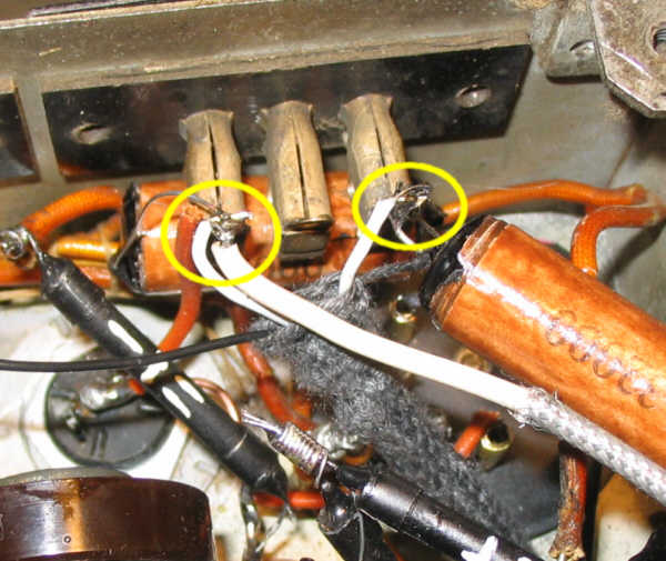 J'ai essayé l'ersatz AF55: - à la place de l'AF2 #2, la réception est correcte en bas de bande (FI en GO) mais pas en haut : normal, il faudrait retoucher les ajustables, l'alignement est à refaire. - à la place de la E446, aucun souci: le son est tout à fait identique à celui obtenu avec la vraie lampe. A noter que la tension de G2 passe à 40V (au lieu de 24) et la tension d'anode à presque 180V (au lieu de 172V). voici l'ersatz installé à la place de la E446: Pour la valve 506, j'ai fabriqué un ersatz 506-B, à base d'une 5Y3. (d'ailleurs, tous les essais ont été fait avec un ersatz de ce type qui équipe d'habitude un autre poste) Même un peu usée et sous-chauffée à 4V, une 5Y3 donne encore suffisament de courant pour un poste de consommation moyenne comme le 638A. L'ersatz est simple à faire : il suffit, sur un culot européen récupéré (ou fabriqué) de souder une 5Y3 à laquelle on enlève le culot octal d'origine. Il n'y a rien d'autre à faire que de souder les 4 fils aux 4 fiches. (au bon endroit, bien sûr !) Voici l'ersatz installé Pour la E463, j'ai essayé l'ersatz à base de la partie pentode d'une ECL805. Les tensions restent conformes, l'amplification est correcte, mais de la distorsion apparait lorsqu'on pousse le volume (alors qu'avec une E463, la distorsion n'apparait que presque à fond) J'ai aussi essayé des 6F6. Cet ersatz fonctionne encore mieux, sans pratiquement aucune distorsion, à la condition d'utiliser une 6F6 très bonne (neuve); dans ce cas, les tensions sont correctes (+HT et -HT) Voici l'ersatz à base de 6F6 installé sur le poste