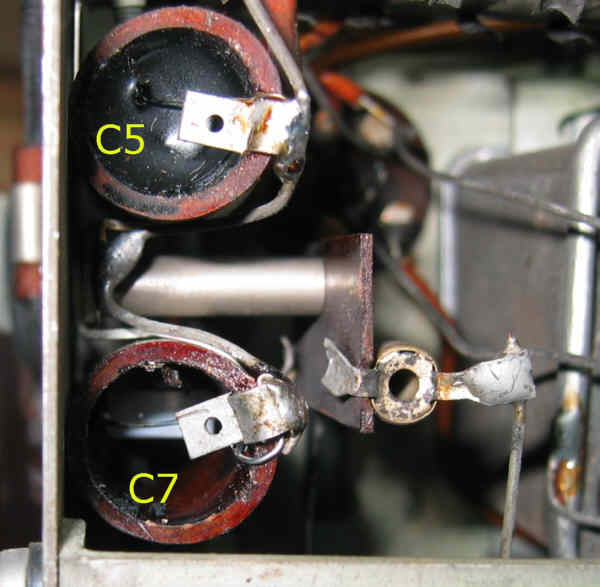 Les condensateurs sont les composants qui varient le plus avec le temps. Sur certains récepteurs, il n'en reste pas beaucoup de corrects, on va voir si sur cleui-ci, quelques uns sont bons tout de même ... Comme d'habitude, je fais deux mesures : une mesure de capacité et une mesure d'isolement sous tension. Si la capacité a trop varié ou si l'isolement n'est pas bon, le condensateur sera remplacé. Toutefois, suivant la fonction du condensateur, on peut admettre de grandes variations de capacité et/ou un isolement imparfait. Nous allons voir au cas pas cas, ce que cela veut dire; voici le tableau de mesures : Je n'ai mesuré que les condos "papier" ou électrolytique (il n'y en a qu'un : C14), car par exéprience, je sais que ce sont ceux qui vieillissent mal. Les autres (au mica ou à air) ne varient quasiment jamais. Dans la colonne de gauche, les repères colorés correspondent aux 2 boites de conserves. On constate qu'il n'y a pas franchement de condos hors-service, mais j'ai quand même remplacé certains, voici pourquoi : * C1 : la fuite de 2mA, n'est pas vraiment gênante, d'autant que C1 est connecté sur le secteur. Cependant, si cette fuite augmente, il y a danger pour l'ampoule de cadran qui est en série. Par précaution, j'ai donc changé C1 * C3 : la fuite de 1,6mA parait faible, mais C3 est un condo de découplage de la tension d'écran de L1. Une fuite se traduit alors par une tension d'écran trop faible, donc un gain HF diminué. C'est clairement une des fonctions qui ne tolèrent pas un condo fuyard, je change ! * C7 : la fuite de près de 4mA ne serait pas trop gênante car ce condo découple la tension d'anode de L1. Mais 4 mA dans R7 qui fait 1k, c'est 4V de perdus, donc de l'énergie dépensée. * C14 : la fuite ne serait pas gênante puisque C14 est le découplage de cathode de L4/L5. Mais je le change car sa capacité a diminué de 50µF à 18µF : le découplage serait déficient dans les graves. Les condos C9, C25 et C33 fuient un peu aussi, mais là, ce n'est absolument pas gênant. C9 et C33 sont des découplages de cathode (de L1 et L33), donc leur fuite sera négligeable devant le courant cathodique. C25 ne sert qu'en PU, donc pas gênant. Notons que C27, le fameux condo de liaison de grille des pentodes BF de puissance fuit vraiment très peu : 0,1mA. Je ne l'ai pas changé pour l'instant, je verrai pendant les essais si je dois le faire. Comme C27 est vraiment très accessible, ce n'est pas un problème de remettre à plus tard son remplacement ... Voici quelques photos des condos que j'ai changés : Dépose de C7 Rénovation de C7 < Repose de C7 (je n'ai pas bouché le tube, ce n'est vraiment utile, et ainsi, on voit bien que C7 a été "modernisé" Mesure et dessoudage de C1 et C3 Dépose de C1 et C3 Dévissage et soulèvement du support de L5 pour accéder à C14 Dépose de C14 et conservation de la boudinette d'origine pour raccorder le nouveau condo Soudage de la connexion "+" du nouveau condo sur la boudinette Les écrous de C14 sont enlevés pour faire de la place, il ne faut pas que la vis touche la boudinette ni les fils correspondants Le nouveau condo soudé (en jaune : + , en vert : -)