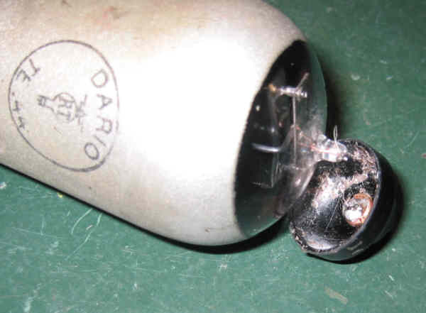 Les autres lampes sont installées. Commutateur sur GO, CV réglé à peu près sur FI (160 kHz), une antenne, un HP ... prêt ? Feu ! Et bien après une minute de chauffage, je reçois tout à fait correctement l'émission. Ce poste est sauvé ! Je peux continuer de réparaer la E444...j'ai percé et taraudé M4x70 un ancien téton de lampe HS , puis j'ai vissé une vis M4x15: j'ai étamé la tête de la vis à l'intérieur : puis j'ai raccordé le petit fil de la E444 : Enfin j'ai collé le téton sur l'ampoule : Voici la E444 réinstallée sur le châssis : (j'ai collé de travers le téton car la boule de verre touche à la tête de la vis, j'ai donc du la décaler) Voici maintenant les tensions relevées sur tout le circuit, avec toutes les lampes (sauf l'indicateur néon) : version PDF Il est temps de s'occuper des "détails" : éclairage du cadran, indicateur néon, transfo et HP ...