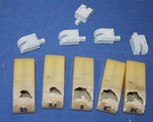 Les boutons ont vraiment mal vieilli. La matière se désagrège avec le temps. Je pense que ce doit être le même plastique que les postes "Fada" tant recherchés, du moins ceux qui sont encore intacts. Toujours est-il que le plastique se craquèle, s'émiette et les trous s'agrandissent à chaque fois qu'on manoeuvre le bouton. Pour l'instant, les boutons sont toujours fonctionnels, mais ça ne va pas durer : un jour ou l'autre, un des boutons va carrément casser et risquer de se coincer dans le bloc tuner (donc démontage en perspective) D'abord, à quoi servent ces boutons ? A syntoniser directement sur une station préréglée. En appuyant sur un bouton, on établit le contact permettant d'alimenter l'électro qui débraye le mécanisme de réglage manuel. En même temps, l'appui du bouton enfonce (ou tire) les noyaux des bobines. D'ailleurs le mécanisme est très astucieux : le bouton appuie sur une tige au bout de laquelle on trouve 2 doigts. Un qui appuie sur une tringle qui pousse les noyaux, un autre qui appuie sur une tringle qui tire les noyaux. L'angle que forme les 2 doigts par rapport à l'axe de la tige détermine la position des noyaux. Les doigts peuvent donc s'orienter grâce à la rotation de la tige. La procédure de réglage est donc la suivante (voir le document d'origine, en anglais) : - enlever le bouton de la station à prérégler en poussant le levier de verrouillage situé sous le bouton vers la gauche, en même temps que l'on tire le bouton - dévisser la molette au bout de la tige de quelques tours - en maintenant appuyé la tige, tourner le bouton de syntonisation manuelle - lorsque la station désirée est reçue, relâcher la tige et resserrer la molette assez fortement - remettre le bouton en l'enfonçant jusqu'à ce que le levier se verrouille On voit donc que cette opération nécessite un bouton en bon état, puisqu'on doit le tirer pour l'enlever, puis le repousser. En plus, le levier de verrouillage est une lame ressort coincé dans 2 rainures intérieures du bouton. Si celui-ci se désagrège, à un moment donné, la lame va se déboiter et se perdre. Bref, je vais tenter de reproduire ses boutons. Pour avoir un fini pas trop mal, la résine s'impose. Il faudra la peindre car il est impossible de teinter dans la masse de la résine en blanc (même crême). Il faut donc que prenne l'empreinte de chaque bouton (car ils sont tous différents puisqu'ils comportent sur le devant une lettre du mot "BUICK"), empreinte extérieure et intérieure. J'aurai alors 5 moules et 5 contre-moules dans lesquelles je pourrai couler la résine. Vu le peu d'épaisseur des boutons (qui sont une sorte de doigt à section vaguement rectangulaire), il est indispensable de centrer le contre-moule intérieur et le moule extérieur. Il faut donc un outillage support. Cet outillage, je vais le réaliser en l'imprimant en 3D. Voici les étapes de la fabrication : Tout d'abord, dessin des pièces du support : demi coffrage, formant 5 alvéoles qui tiendront les moules extérieurs en place. Il faut deux pièces identiques le fond du coffrage qui ne servira que pendant la prise d'empreinte extérieure. Les plots retiendront les boutons pour qu'ils ne flottent pas sur le silicone liquide les supports "plongeurs" qui serviront de squelette aux contre-moules intérieurs Une fois les dessins réalisés, après 2 moulinettes (Blender + Slice3r), on peut imprimer les 4 pièces : 1: le coffrage assemblé par boulonnage, 2 : fond, 3 : plongeurs Il faut serrer les 2 demi-coffrages modérément pour ne pas risquer de les voir s'écarter en leur milieu.
