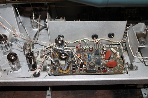Vue de dessous. Le module est le préampli qui remplace les Nuvistors qui étaient câblés sur la grande carte dans la version précédente