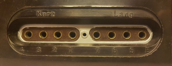 Même chose à droite mais pour la partie GO. Ici, seulement 3 plots sont utilisables (5,6 et 7) pour brancher l'antenne, parce que le quatrième plot, le plus à droite, celui qui est libellé E (Pour Erde) est réservé pour la prise de terre.